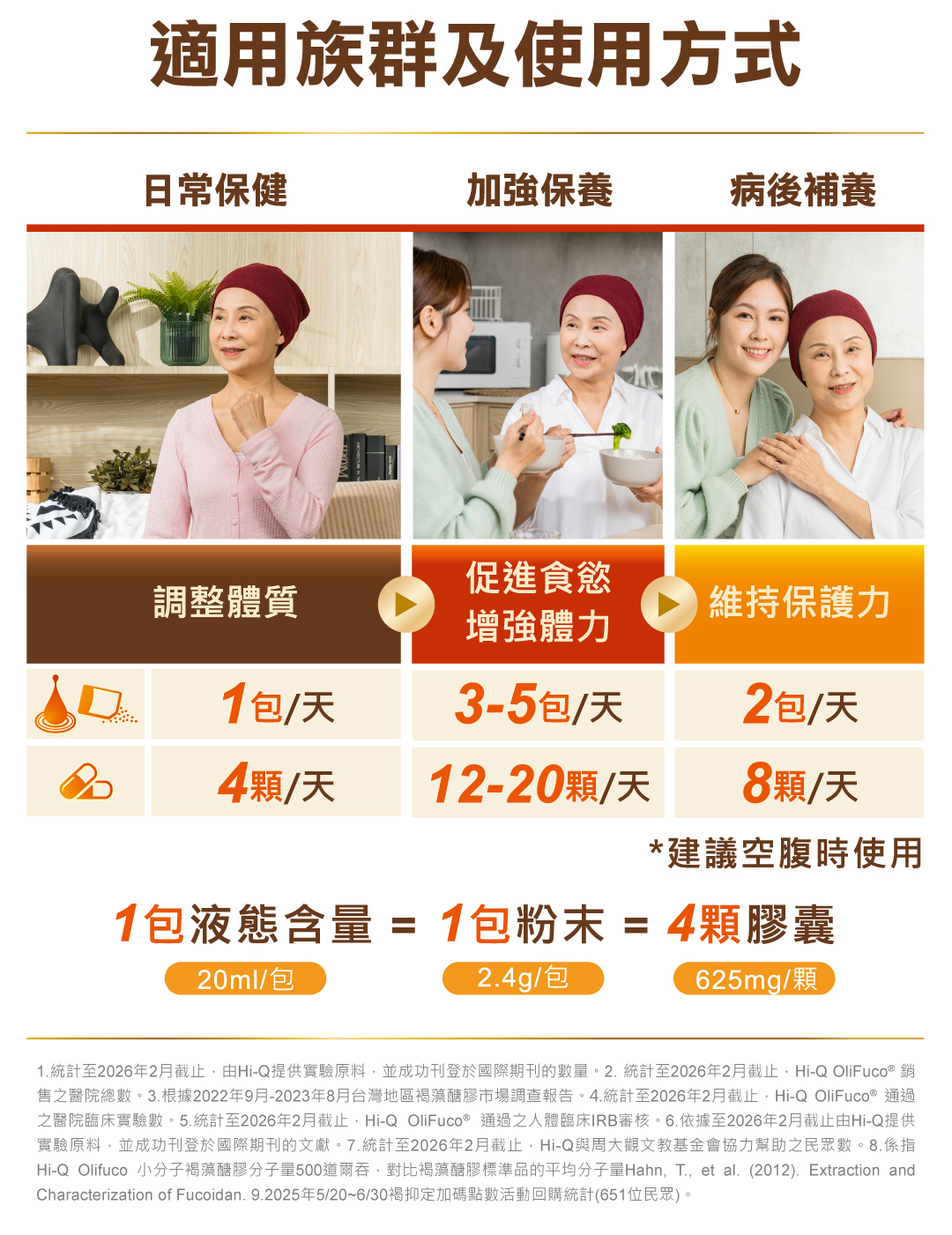 Olifuco®小分子褐藻醣膠經醫學中心試驗證實對於「關鍵時刻」健康維持率可達 93%,選用有通過人體臨床試驗、多間醫學中心/醫院採用的褐藻醣膠產品,對於品質方有保證。